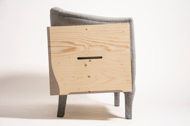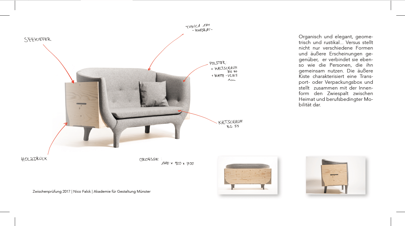 Oder Nico. Nico Falck hat ein Sofa gebaut, das die heutige, erforderliche Mobilität kombiniert mit einem Stück Heimat darstellen soll. Ein Sofa in der Kiste, sozusagen. Schnell eingepackt und mitgenommen, aber trotzdem das gemütliche Nest immer dabei. Tolle Idee! Oder der Grafik Chair von Jonas: „Durch sein Design zeichnet sich der Graphic Chair mit seinem grafischem und winkligem Auftreten stark aus, und bietet durch seine breite Sitzfläche eine angenehme Sitzpositzion und zur Rückenlehne einen optimalen Sitzkomfort, der durch die Polsterung unterstützt wird.“