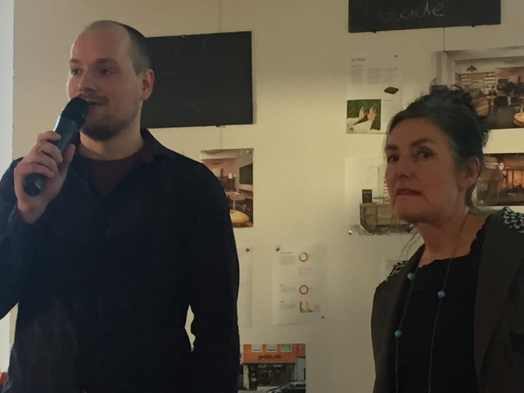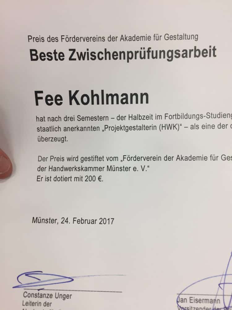 Alle 35 Prüflinge wurden bei der Zeugnisübergabe mitsamt ihrem beruflichen Hintergrund und ihrem Projekt vorgestellt und mussten auch selber ein paar erklärende Worte abgeben, was wir ganz toll fanden und der Bezug zu dem Möbel oder dem Entwurf erst richtig herstellte. Die besten drei Ergebnisse bekamen eine Auszeichung, und, als stolze Eltern muss ich das erwähnen, Fee gehörte dazu :-)